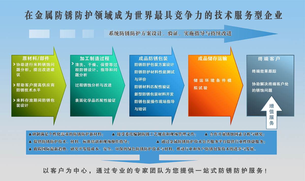 通過(guò)一站式、標(biāo)準(zhǔn)化、差異化、增值化的服務(wù)來(lái)降低客戶(hù)的心理成本和使用成本,最終提高客戶(hù)的收益,使沈陽(yáng)防銹服務(wù)“超越客戶(hù)期望,超越行業(yè)標(biāo)準(zhǔn)”,成為防銹業(yè)服務(wù)的旗艦品牌。