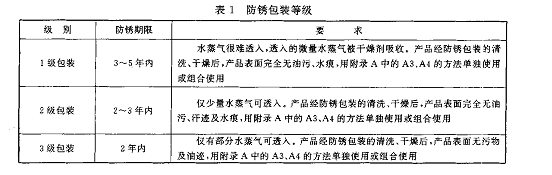 ①包裝的防銹等級應根據(jù)產(chǎn)品的抗銹蝕能力、流通環(huán)境、包裝容器的結(jié)構(gòu)、包裝材料的一般性能等因素來確定,防銹包裝等級分為:1級包裝、2級包裝、3級包裝.詳見表1,